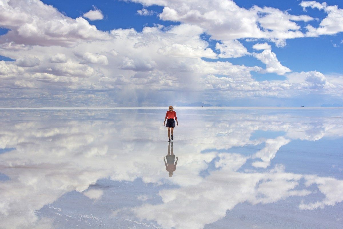 Bầu trời xanh, mây trắng, ánh nắng và cả con người đều được phản chiếu hoàn hảo dưới chân. Ở Salar de Uyuni, bạn không còn phân biệt được đâu là trời, đâu là đất – chỉ còn cảm giác như đang bước đi giữa vô cực.